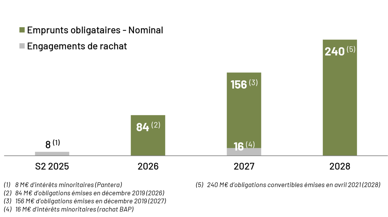 - Pour rappel, le Groupe a revu courant T1 son financement bancaire à moyen terme avec une ligne de crédit ajustée à 625 M€, et a revu le niveau de ratio de levier intégré dans les covenants comme suit : <8,5x à fin 2025, <7x à fin 2026 et ≤3,5x à fin 2027.