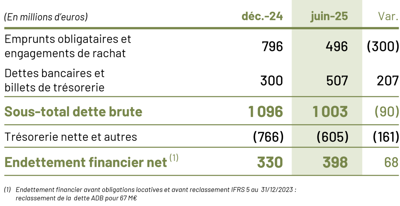 L’endettement net du Groupe avant obligations locatives s’élève à 398 M€ à fin juin, une hausse limitée (+68 M€) comparativement aux hausses observées historiquement au premier semestre du fait de la saisonnalité des activités de promotion, grâce notamment à la poursuite d’une gestion stricte du BFR.